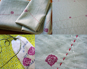 Last weekend a colleague married in Greece. I couldn't make it to Greece, but attended her bachelor party. For this occasion I remembered my dear friends blog on vlijtig. I took good quality lightbluegrey linen and sewed this tablecloth with two matching napkins. After embroidering I wanted to copy the idea of the initials, but that didn't work out. My daughter was at the same time making a drawing of a bride and groom, with roses. Et voilĂ , see here the result! The roses are 1,5 cm only and are cut out of a HEMA eraser. In the end the most difficult part of the job seemed to make a nice and recognizable drawing of a rose.