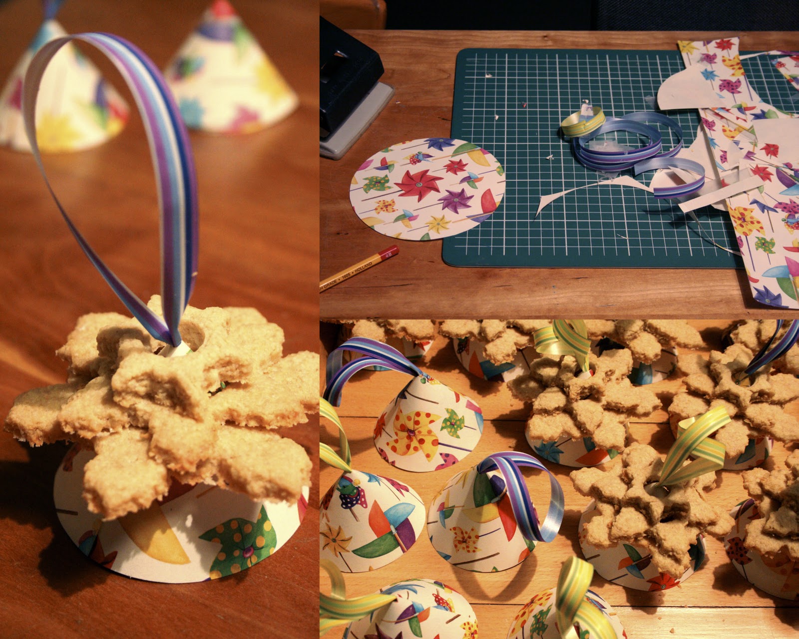 Making this treat for school some time ago was good teamwork: F was busy backing the cookies in three sizes, while I was sitting at the kitchen table to cut and model the paper cones.