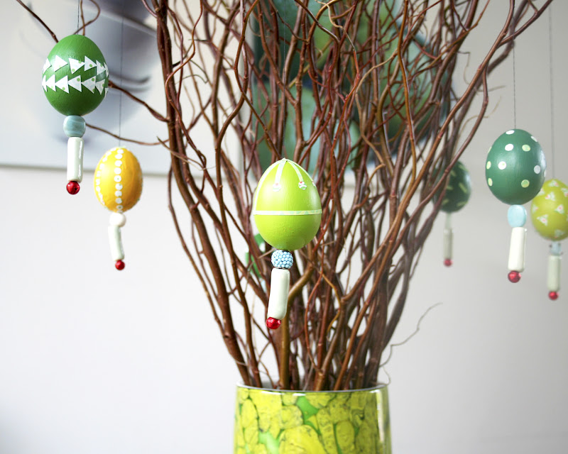 ... by punching tiny holes, blowing the content out of it, breaking some when doing this, cleaning afterwards the egg yolk from the terrace, painting, dropping one, decorating and dropping another just before hanging them. Fun!