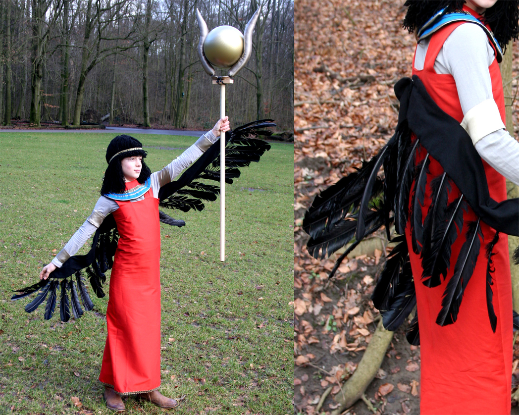 On Saturday M and I did some shopping: we needed golden ribbon and feathers. We loved the black ones we found finally! Sunday evening her hair, wings and dress (super simple but with a blind zipper on the side) were ready to wear, but her collar failed (after my try to sew circles of slippery golden fabric and cotton fabric). After using interfacing for the golden fabric her collar (or do I need to call it a necklace?) turned out fine.Her wings were attached to the back of her dress by press buttons. We tried and tried, but didn't succeed to fix her typical sun-between-two-horns on her head. So in the end F changed the head attribute into a staff. If L wants to wear this costume as well when she is in the fifth class, we've got four more years to find a solution for the headdress. I'm curious!
