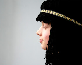 Last weekend we have been very busy for next Friday's carnival! We had fun making this typical hair. First we wrapped the yarn around the back of a chair. Then the yarn was taped together and cut. In total we had three bundles. Funny to sew taped yarn (just along the tape), it's something else than a dress! After removing the tape we were ready to make the haircut on M's head! I tried to cut it as straight as possible. The golden ribbon was finally sewn across the fringe and is used to keep the hair stay in place. Piece of cake!She's already so happy: she comes home from school and gets dressed immediately, until falling asleep. And this morning even at breakfast. And sure, Friday she will Walk like an Egyptian.