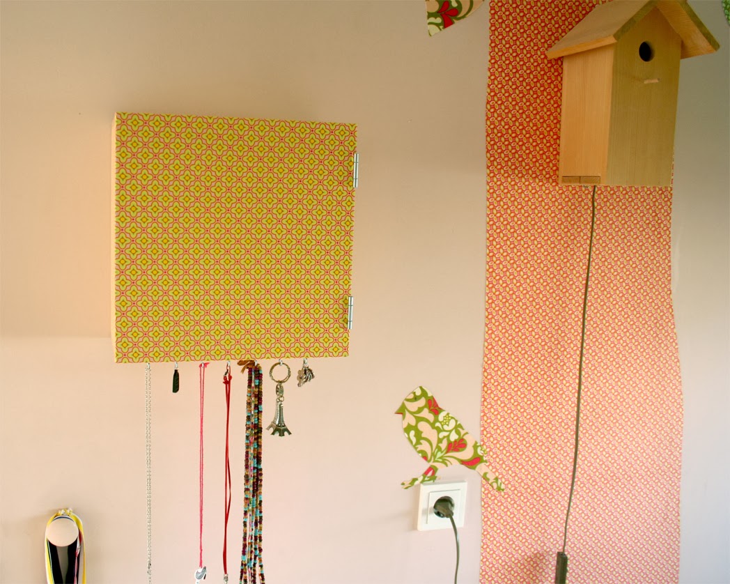This locker is hanging on M's bedroom wall in order to organize nail polish, hair elastics, etc. It's a present we made for M's birthday last summer, but never showed it on this blog because the green edge had still to be crocheted. Now it's like it was in my mind.