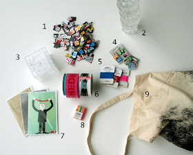 1. magnetic letters 2. nice size drinking glasses  3. labyrinth money box (great to get it opened!)  4. hair accessories  5. elastic and nylon thread  6. tape, tape and velours ribbon  7. postcards  8. sticky notes  9. printed linen bag