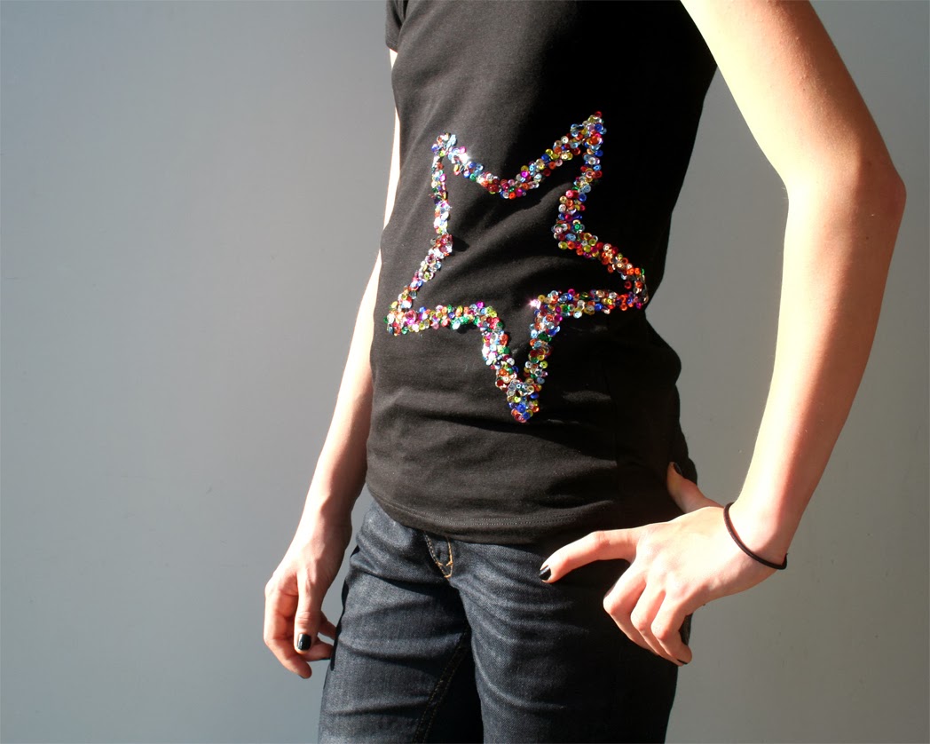 Last Friday M's teacher invited international and national popstars on her birthday. M turned into her favorite singer Anouk and therefor she whipped up a proper t-shirt the day before, using sparkling leftovers from this