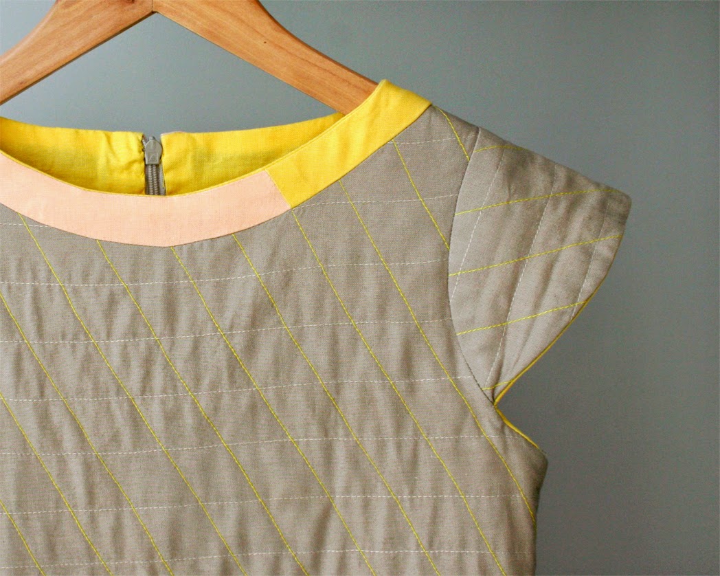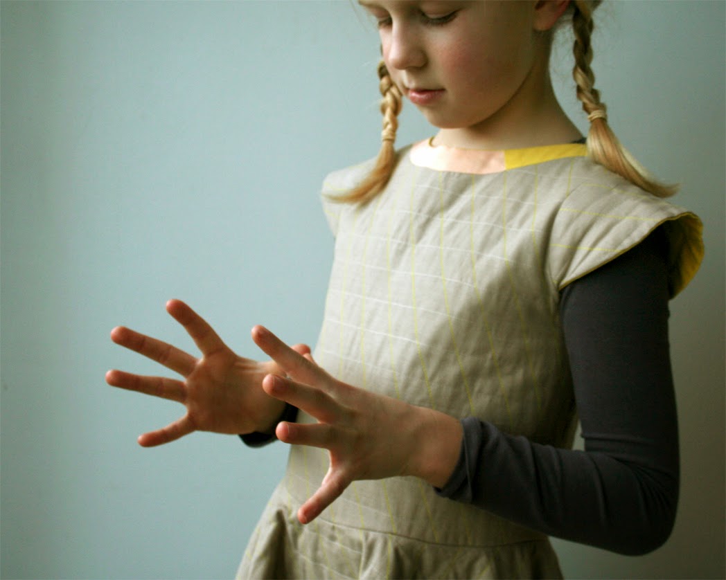 About the topstitching a final note: my head wasn't able to finish this laborious job. I decided to decrease the number of yellow lines of the skirt. And I was happy about that: the handmade look of the fabric is more obvious now and I like the change of embossment, something you might not see at once, but only when you look closely. This kind of perception on different scales is my cup of tea.