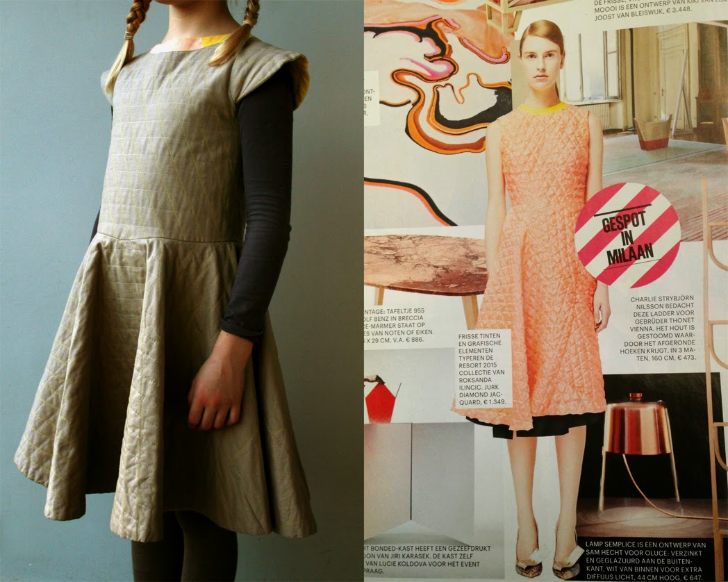 Some weeks ago I was attending a dentist visit with my youngest, and while waiting I was flipping through a magazine. When my eyes fell on the picture above, I knew all of a sudden how L's birthday dress would be. And this idea was there to stay; the egg hàd to come out soon after.
