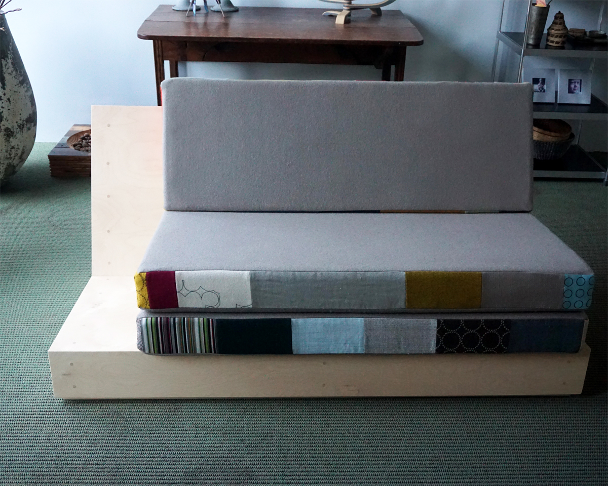 The cushions are custom made, but the covers are made by me. The making appeared more difficult than I had in mind. I used Kvadrat samples for the sides, the rest is made of a warm grey wool fabric with a felted look. Some samples appeared too thick for the corners, but because of timepressure I couldn't change the composition anymore. Better corners are something to improve next time.