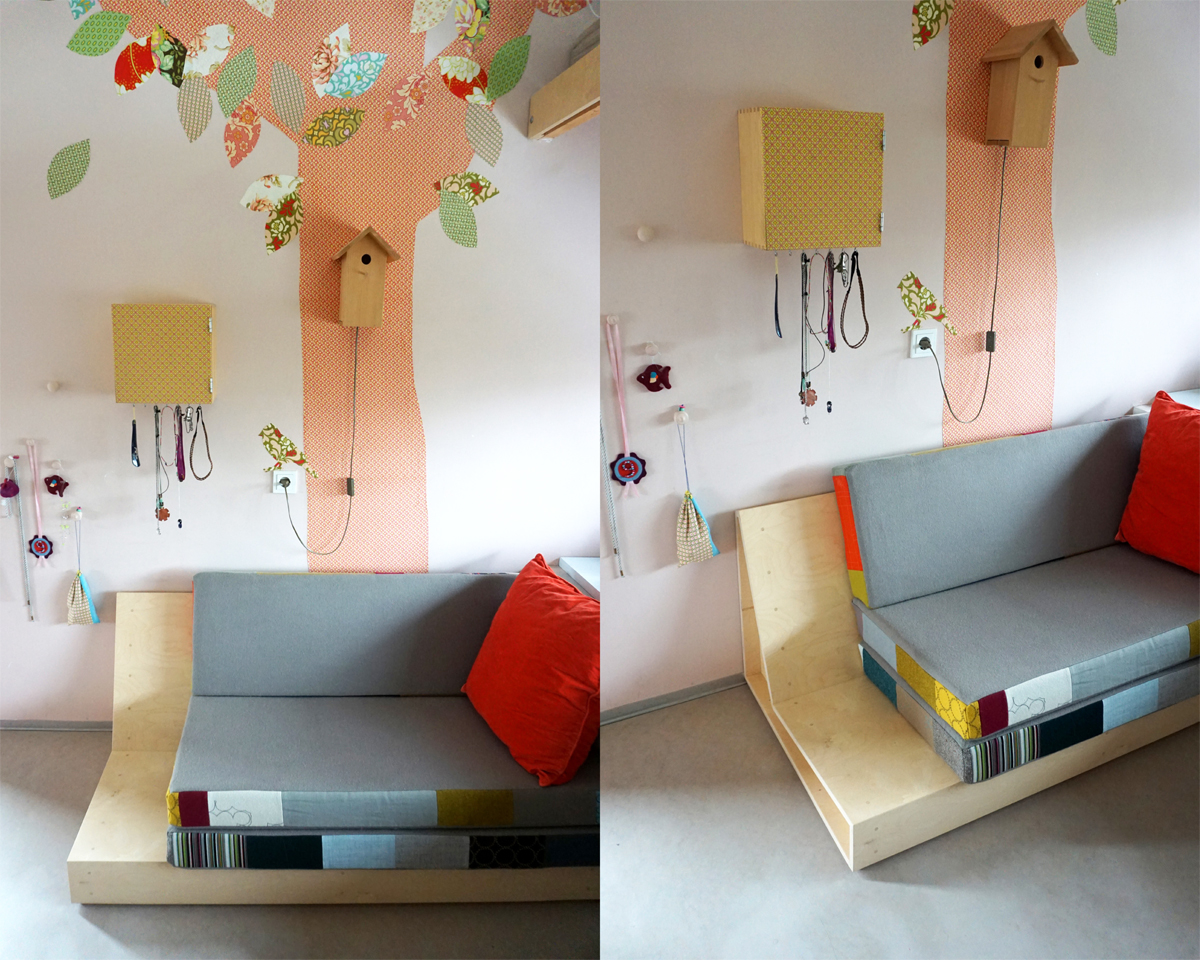 On the first picture you see the couch installed in her room, where she is able to use a soft pillow in the corner. Welcome to the teen lointerer!